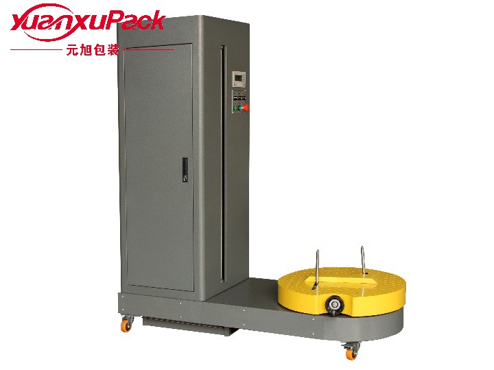 行李型纏繞機是專為機場包裝行李等而設(shè)計的,在行李運輸過程中起到保護的作用,防止破損,防止行李被調(diào)換等現(xiàn)象。設(shè)備可以移動,操作人員將行李放到轉(zhuǎn)臺上,并根據(jù)行李的大小來調(diào)節(jié)垂直桿的,從而使行李可以平穩(wěn)的放在轉(zhuǎn)臺上。然后操作人員按操作面板上的啟動按鈕,設(shè)備自動進行包裝,一般行李包3—5層即可!包裝完畢后,操作人員手工切斷薄膜,然后取走行李!