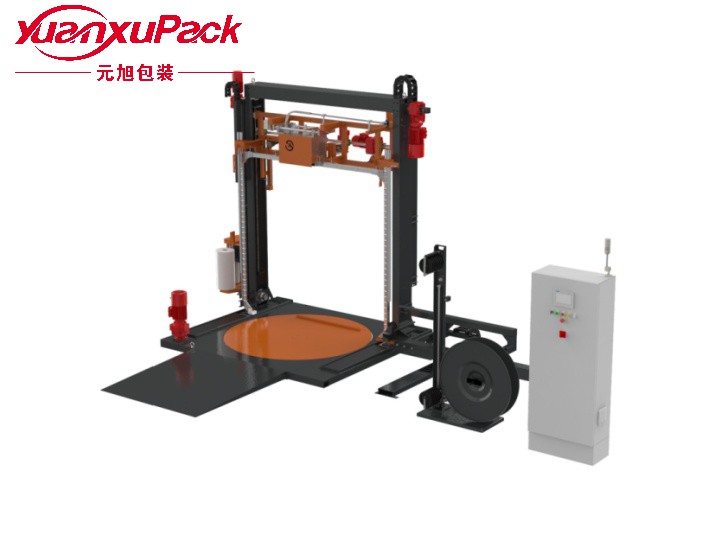 頂打式纏繞打帶一體機將穿箭打帶機與全自動纏繞機結合在同一個工位上,極大地節(jié)省了空間和成本,通過水平穿箭的方式實現(xiàn)弓架閉合,將棧板和產(chǎn)品進行垂直方向的平行打包,自動完成、送帶、收帶、拉緊、摩擦焊接、剪帶及纏膜等一系列捆扎工序,可根據(jù)貨物移動到合適的打帶位置,自動上、斷、繞膜機構,自帶轉盤可完成打帶后的自動纏膜,接口的位置在貨物的頂部。